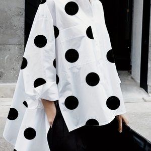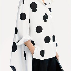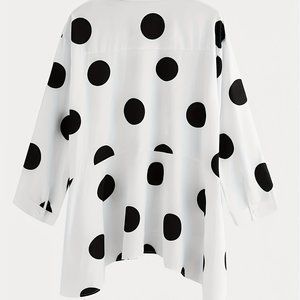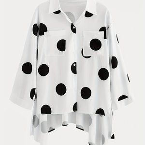 This blouse features an eye-catching polka dot print, a button front closure, and a dipped hem for a fashionable look.