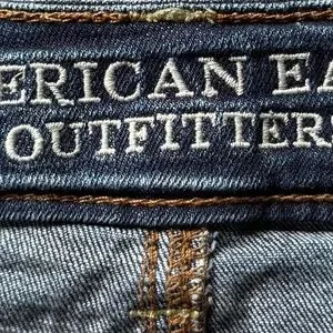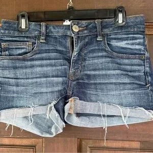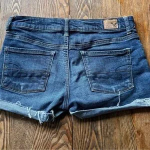 These blue jean shorts from American Eagle Outfitters boast a relaxed, distressed cutoff style with frayed edges and natural fading, offering a casual and effortlessly cool look.