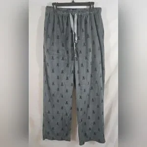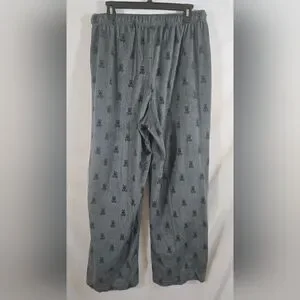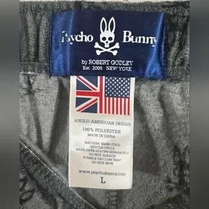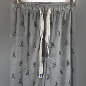 Psycho Bunny men's gray terry lounge pajama pants with a pattern of the Psycho Bunny logo (a skull and crossbones with bunny ears) all over. They are a size large. They measure approximately 42" from the top of the waist to the bottom of the leg with a 30" inseam. Great condition.