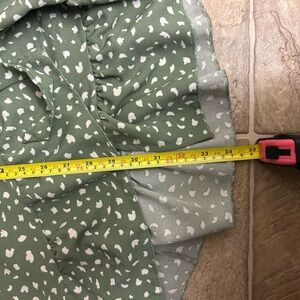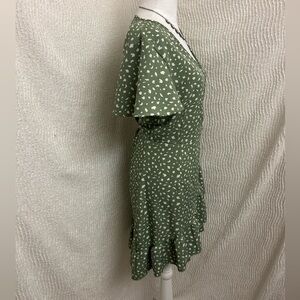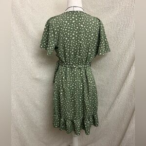 This naggoo wrap dress is effortlessly cute with a soft green hue, white print, and playful ruffle hem. The flattering wrap fit cinches the waist while the lightweight fabric keeps it breezy for warm days. A perfect pick for brunch, beach vacations, or garden parties. Pair with strappy sandals or white sneakers for a laid-back, flirty vibe. Size medium. Does have a little small snag on the front, see picture