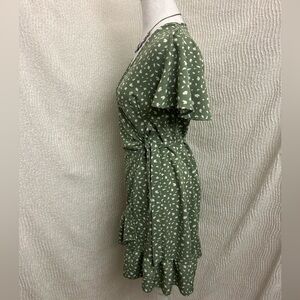 naggoo Green Wrap Dress White Print Size Medium Short Summer Ruffle Hem Flowy
