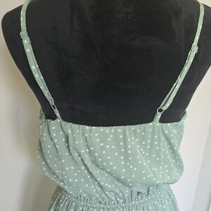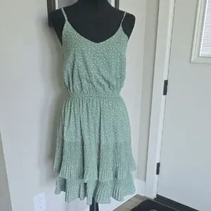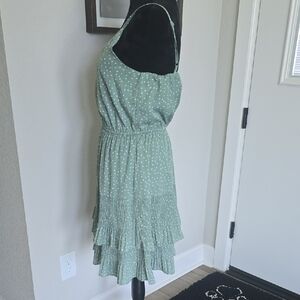 Like new! Embrace a casual, resort-ready look with this She + Sky sundress, featuring a green hue and delicate white dots. The sleeveless design boasts spaghetti straps and a flattering V-neckline, while the ruffled, tiered mini skirt adds a playful touch. Crafted from lightweight fabric, this dress offers a breezy, feminine silhouette perfect for warm days. Lined with adjustable straps. 17" armpit to armpit. Elastic waist 11.5" unstretched.