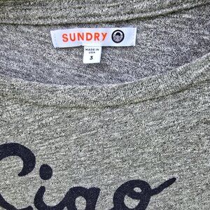 Lot of three Sundry tees size 3 or Large. In good used condition. One short sleeved grey "Malibu Southampton Cannes" , one short sleeved green "feelin' fine" embroidered, and one long sleeved grey "Ciao Bella". All measure 20" pit to pit lying flat. Price is for all three.