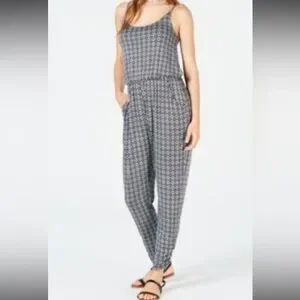 This American Rag jumpsuit in a sleek black/white design features a relaxed fit with tapered legs for a modern silhouette. The elasticized waist adds a touch of definition, making it a comfortable yet stylish choice for any casual outing. Its sleeveless design and lightweight fabric make it ideal for warm weather wear.