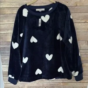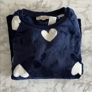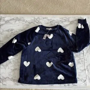 This incredibly soft navy blue sweater featuring white heart designs is adorable and ideal for a cozy look. ☁️✨