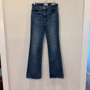 High-rise jeans with subtle distressing and a bootcut silhouette.