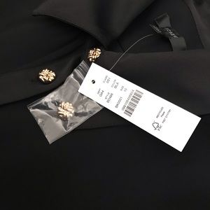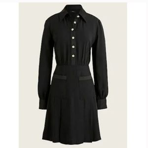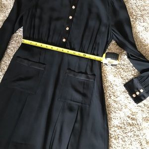 Elegant black shirt dress. Long sleeves with glass button details and a pleated skirt. It also has two front flat front pockets with tuxedo piping. Glass buttons on the sleeve cuffs. Perfect for versatile styling. Very classy. I bought it new and wore it once. It has been recently dry cleaned.