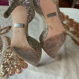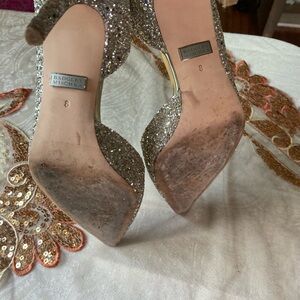 Step into elegance with these Badgley Mischka heels, featuring a stunning silver glitter finish that captures the light beautifully. Designed with a classic pump silhouette and a moderate heel height, they offer both sophistication and comfort. Perfect for weddings or any formal occasion, these heels are a timeless addition to your collection.
