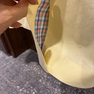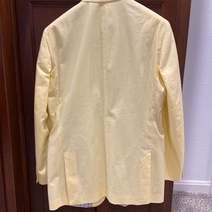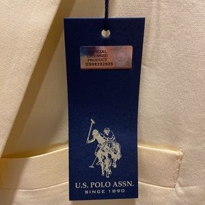US POLO ASSN. JACKET IN YELLOW. ALL POCKETS STILL SEWN SHUT LINED ALL BUT SLEEVES. MANY POCKETS INSIDE NWT IT SEEMS THERE ARE NO BUTTON HOLES ON THE SLEEVES. MUST HAVE THEM DONE PURCHASED THIS WAY. SHOWS IN PICTURE ASK QUESTIONS PLEASE.
