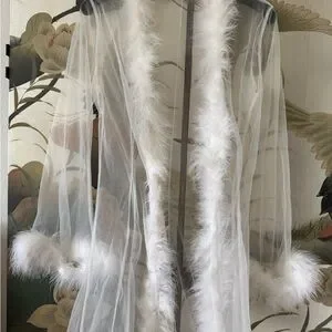 This one size fits all white mesh feather trim robe is in excellent condition worn once. Would be ideal for pre-wedding bridal look, bridal boudoir look, or to be extra around the house!