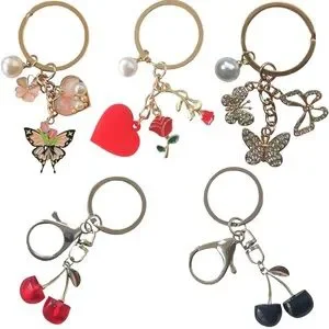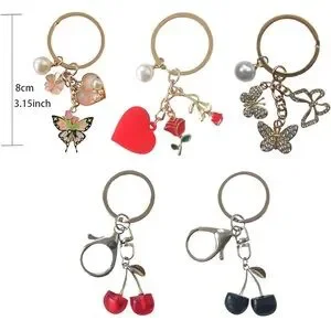 5-Pack Charm Keychains for Women Bag Purse, Pearl and Crystal Butterfly Design, Cherry Heart Rose Pendants cute keyrings