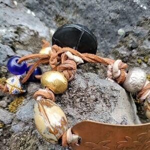 Unique handcrafted bracelet featuring a copper piece with a palm tree design. On either side of the copper piece are two ceramic beads followed by two metal beads (one silver, one gold). Closure is a big button and loop. The ends of the leather pieces have beads as well. Cool, funky vibe.