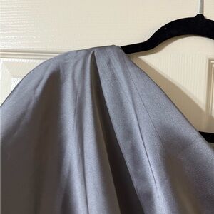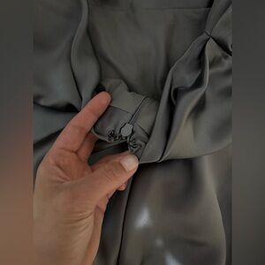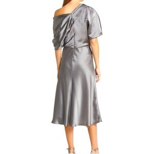 AMSALE off the shoulder fluid satin cocktail midi dress gunmetal