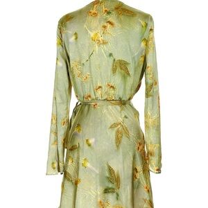ZARA Pale Green Silk Wraparound Leaf Dress with Gold and Red Leaves