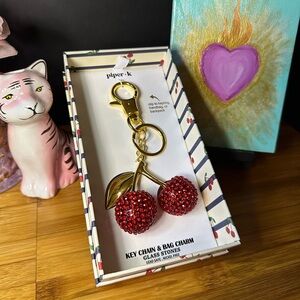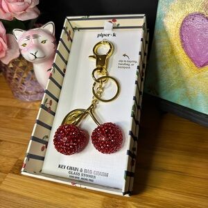 Sparkling red cherry keychain and bag charm by Piper K. Features gold-tone hardware. Not the average cherry bag charm. Every sparkling red rhinestone is in place and shines just as bright from every angle. The gold tone hardware shines bright as well. Comes beautifully boxed making this the perfect gift to give or to treat yourself to.