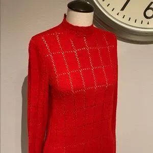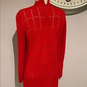This Vintage knit dress in a striking red hue is perfect for work or cocktail occasions. Featuring a sophisticated mock neck and long sleeves, it offers a classic silhouette with a touch of modern elegance. The dress is crafted from a structured fabric, ensuring a polished and refined look.