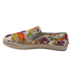 Step into a world of color with the Wanted slip-on sneakers, featuring a striking red and orange palette. These canvas shoes boast a vibrant, hand-painted mandala-like design, perfect for making a bold statement. With their easy slip-on style and comfortable white rubber sole, they're ideal for casual outings.