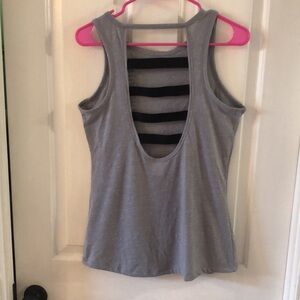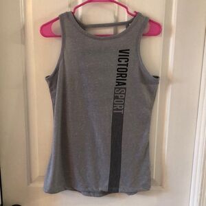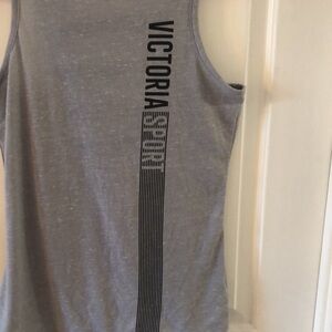 Victoria Secret Sport Tank Top, Size small, Gray & black colors with white lines throughout, Victoria Sport written in large letters & black lines down the left-hand side of the Tank top, 4 thick black bands across the back of the tank top As shown in Picture no. 4!, Great to work out! Measures approximately 18-1/2” from armpit to armpit & 26” long, NWOT