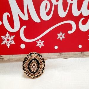 Black enamel and 24k gold-washed filigree with Austrian crystals.