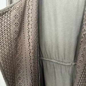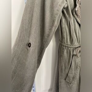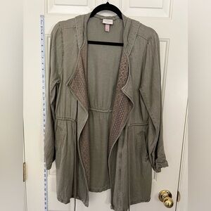 This Olive green open front jacket is styled with open tab lace inserts and drawstring that cinches at waist. Roll tab sleeves offer versatility. Perfect for vacation, hiking or just a day out with multiple pockets.