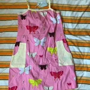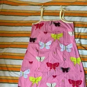 Charming pink dress with colorful butterfly print. Features two front pockets. Perfect for casual wear.