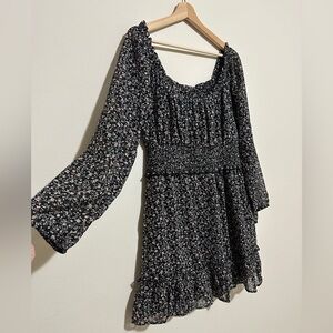 This stylish sundress from Indulge features a chic black and white color palette with a ruffled and smocked design. The long bishop sleeves and square neckline add a touch of elegance, making it perfect for a casual night out. Its flowy silhouette and defined waistline offer a flattering fit, while the ruffled hem adds a playful finish.