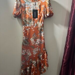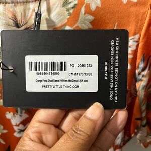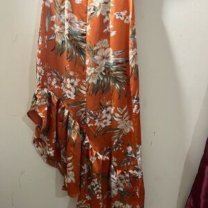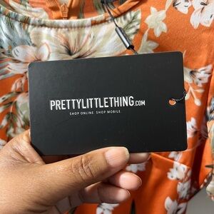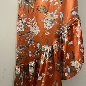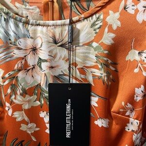Pretty Little Thing Orange floral print dress size 2. Polyester material! Asymmetrical at the bottom. Zipper in the back. Waist: 11 inches, bust: 14 inches, length 47 inches on the long side and 40 inches on the short side. Brand new dress. Very nice! Hem ruffles at the bottom.