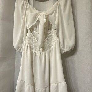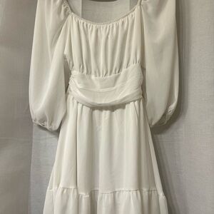 Elegant exlura NWT white dress with open-back design. Features a bow tie and puff sleeves. Teired skirt.