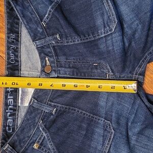 in good used condition. These Carhartt jeans feature a timeless straight leg design in a versatile blue shade. The denim showcases a medium-dark wash with subtle fading, offering a casual and lived-in look. Perfect for everyday wear, these jeans combine durability with style. inseam is 25.5"