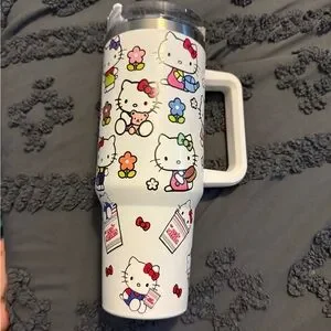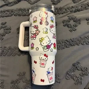 Cute Hello Kitty travel tumbler with floral design. Perfect for on-the-go.