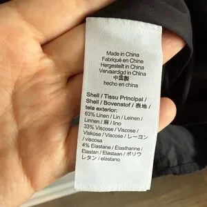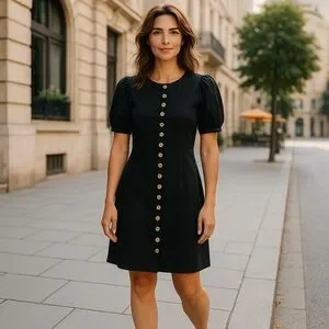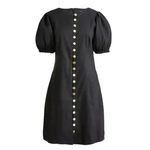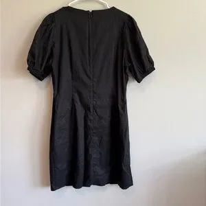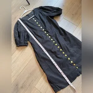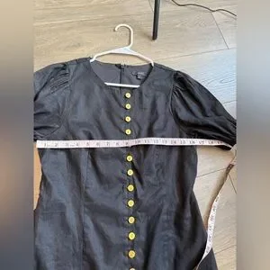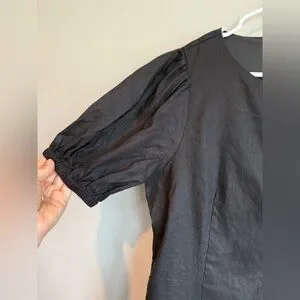 This elegant black dress features a stylish button-down design, perfect for any occasion. The puff sleeves add a touch of sophistication. EUC, linen blend, short sleeve.