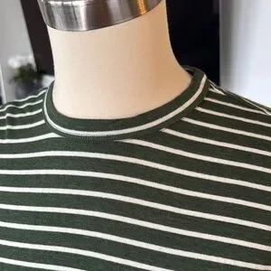 Experience the perfect blend of style and comfort with this Todd Snyder short sleeve tee, featuring a classic green and white stripe pattern. Crafted from lightweight material, this versatile piece is ideal for everyday wear, offering a timeless look that complements any casual wardrobe. 100% cotton, NWT.