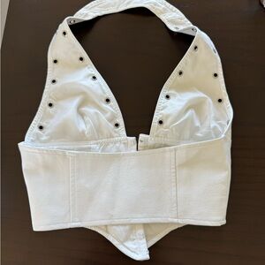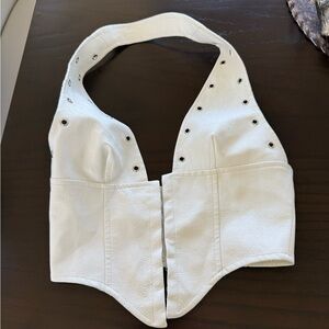 Stylish white leather halter top with stud details. Perfect for a chic look.
