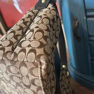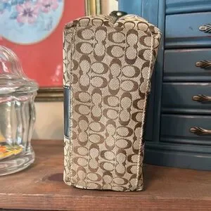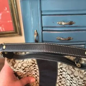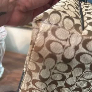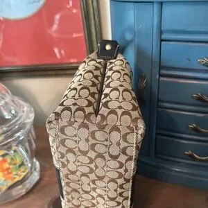 This Coach mini hand bag showcases a sophisticated blend of brown and tan tones, highlighted by the iconic signature design. Crafted with premium materials, it offers a timeless elegance and practicality for everyday use.