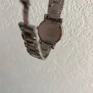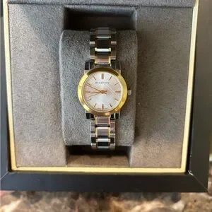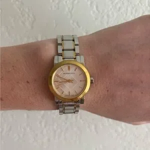 Stylish Burberry watch with gold and silver accents. Features a sleek white dial.