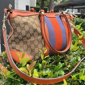 Experience the perfect blend of luxury and style with this Gucci shoulder bag, featuring a striking combination of brown and orange hues. Crafted with precision, this bag showcases the brand's iconic design elements, making it a standout accessory for any occasion.