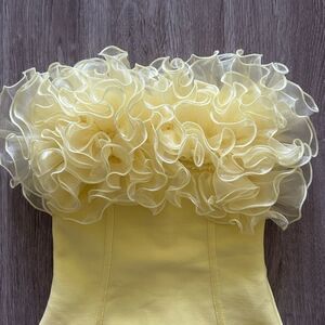 Strapless yellow mini dress with embellished front. Bodycon style from Fashion Nova. Excellent condition, worn once. Size XS. Girl in photo 5’9, dress size 2