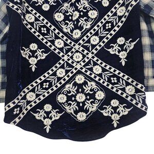 Soft Surroundings Plaid Button Up Shirt XL Velvet Embroidered Navy & Cream