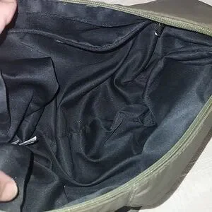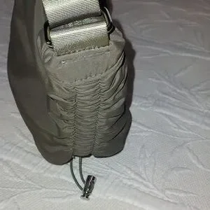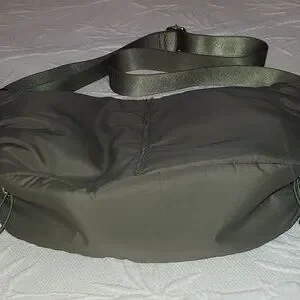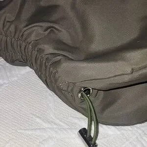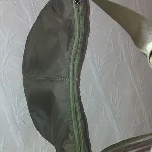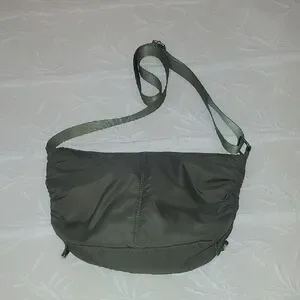 Suze 13" L X 8" H Adjustable strap drop. 21" total strap drop. Zip closure. Drawstring each side. 1 main compartment with 1 smaller compartment with zip closure. Crossbody. Army green with silver accent hardware. Great for hikes, beach, etc. Easy care material.