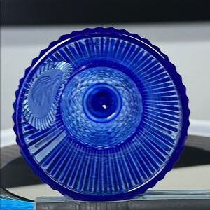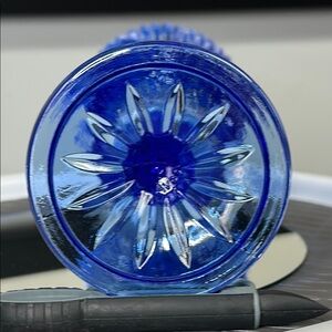 This captivating glass art piece features a rich blue hue, highlighted by a flared top with vertical ribbed patterns and a central medallion relief. The lower section's diamond cut pattern enhances its elegance, making it a perfect addition for art lovers.
