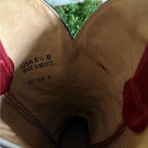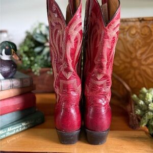 Stylish red cowboy boots with intricate stitching. Perfect for a bold look. Worn only a few times. All leather with the exception of the heel of course. Snip toe. In great condition! Smoke free and pet free home.