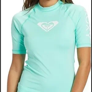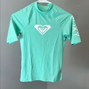 Turquoise Roxy rash guard with logo on chest and sleeve. Short sleeves for comfort. Excellent condition! Tags included but not attached, never worn!