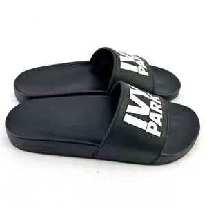 These are pre-owned Ivy Park slides, featuring a black colorway with the brand name prominently displayed in white on the upper strap. The slides are constructed from a smooth, likely synthetic material. The soles show minimal signs of wear, indicating light use. There are no visible tears or significant damage. The overall condition is good, with only minor cosmetic imperfections.