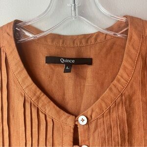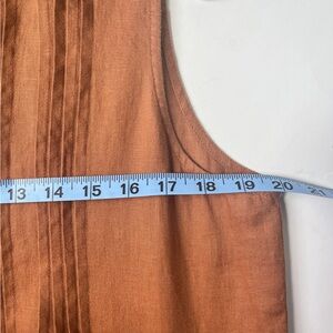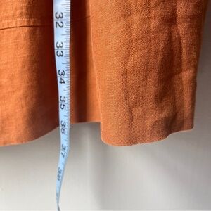 Summer fresh 100% linen terracotta casual summer dress with button-front design. Features pleated accents. Knee length.
