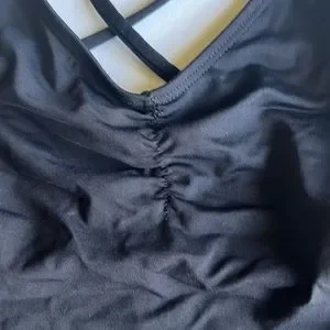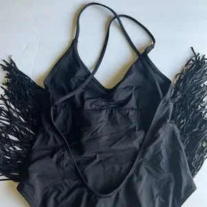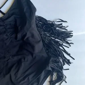 Chic black one-piece swimsuit. Features fringe detailing. Perfect for beach days.