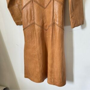 Vintage 70s Brown Leather Maxi Coat Chevron Stitching Retro Boho Womens XS