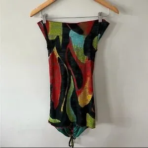 Turn heads in this stunning Kim Shui dress, perfect for a night out or cocktail event. The sleeveless, halter neckline design features bold cutouts and ruched detailing, creating an alluring asymmetrical silhouette. Crafted in vibrant green and red hues, this bodycon dress is both modern and captivating.
