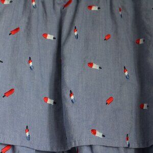 Perfect for summer or the 4th of July! This girl's skirt features a blue Chambray material with a pattern of embroidered Bomb Pops popsicles, along with solid red popsicles. The waistband is elastic in a grayish-blue color - see photos. Tiered ruffles make for a flouncey, cute summer piece. Size L or a 10/12 girls, please see measurements. Skirt is either a mini or knee-length depending on measurements.