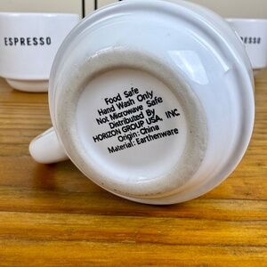 This sleek set of four white ceramic espresso cups brings both function and style to your coffee nook. Each cup features bold “ESPRESSO” lettering and nestles into a compact black metal stand, perfect for saving counter space. Clean and modern, this set is ideal for entertaining or daily use.