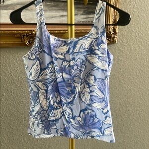 This stylish tank top from Karen Scott features a vibrant blue and white color scheme with a fitted crop design. The top is crafted from a light, stretchy fabric, making it perfect for warm weather. Its tank top style and sleeveless design offer a comfortable and chic look for any casual occasion. P2P 19” length 21” missing material tag